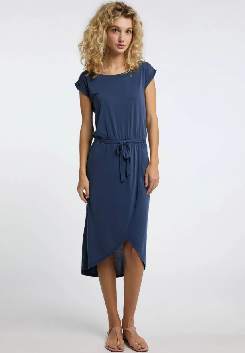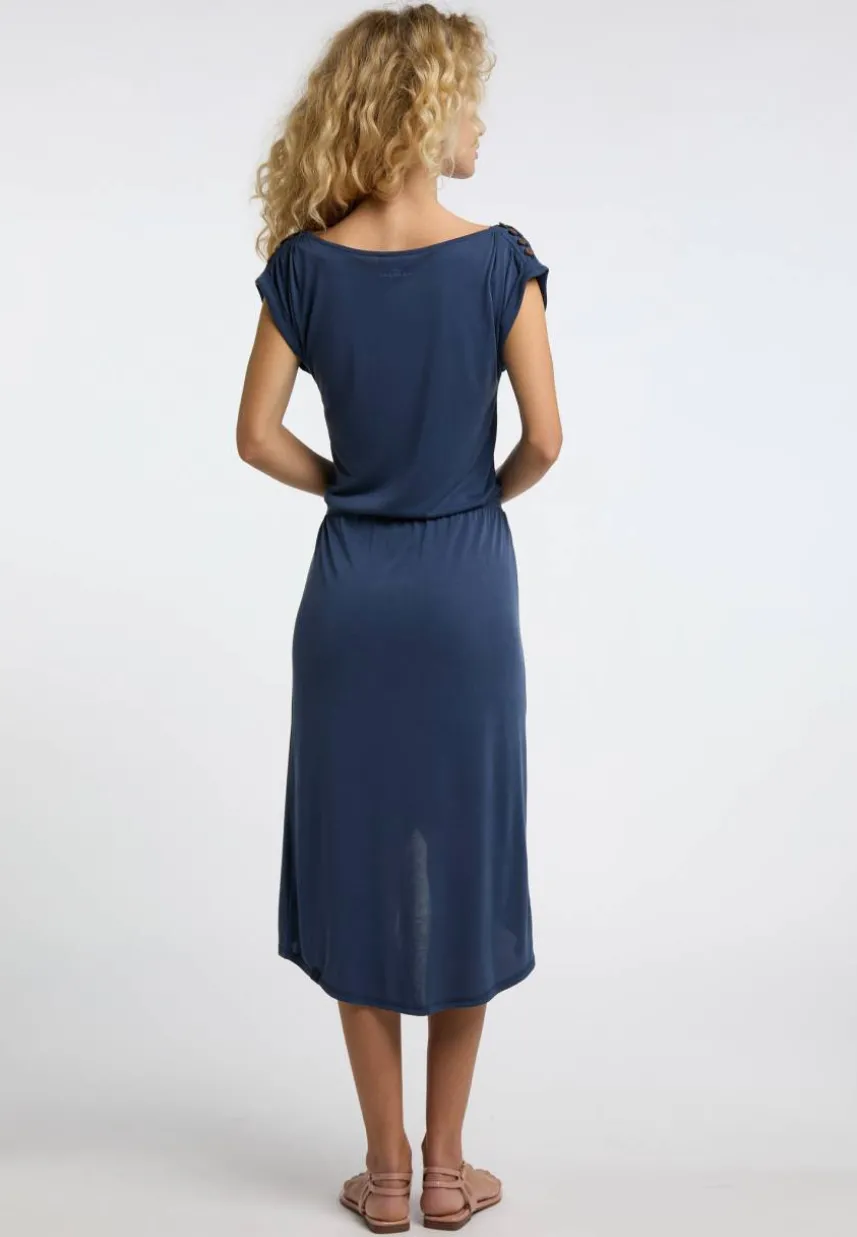 In dem veganen Sommerkleid ‚ETHANY‘ von ragwear siehst Du aus wie eine griechische Göttin. Das weich fließende Material, Raffungen an den überschnittenen Schultern sowie dem Rockteil in Wickeloptik sind ein absoluter Hingucker. Der weite Rundhalsausschnitt ist mit einem kleinen Zierknopf versehen. Auch auf den Schulternähten befinden sich Zierknöpfe. Akzente setzen der Stoffgürtel und umgekrempelte Ärmelabschlüsse. Das Kleid lässt sich alltagstauglich, aber auch elegant stylen.