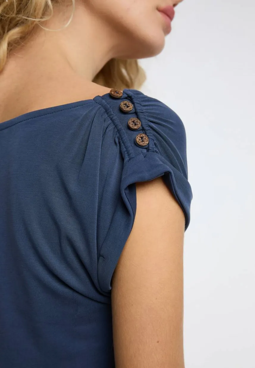 • Lockerer Schnitt mit überschnittenen Schultern mit Raffungen und Zierknöpfen