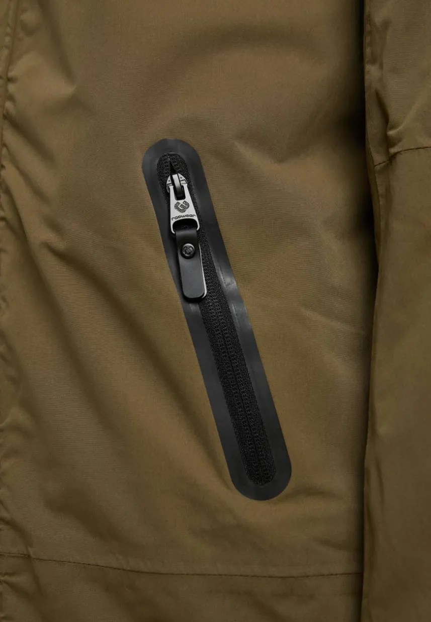 Die vegane Regenjacke ‚HATAR‘ von ragwear ist der perfekte Begleiter für den Winter. Das Design kommt ganz ohne Schnickschnack aus, hat dafür praktische Features, wie seitliche Eingrifftaschen mit wasserdichtem Reißverschluss, elastische Bündchen an den Ärmelabschlüssen und eine verstellbare Kapuze mit kleinem Schirm. Der kleine Label-Schriftzug auf der Brust und der kleine Logo-Patch am Saum sind unauffällig, aber aussagekräftig. Mehr als diese gefütterte, warme Jacke brauchst du nicht, um stylisch, trocken und komfortabel durch Deine täglichen Abenteuer zu streifen.