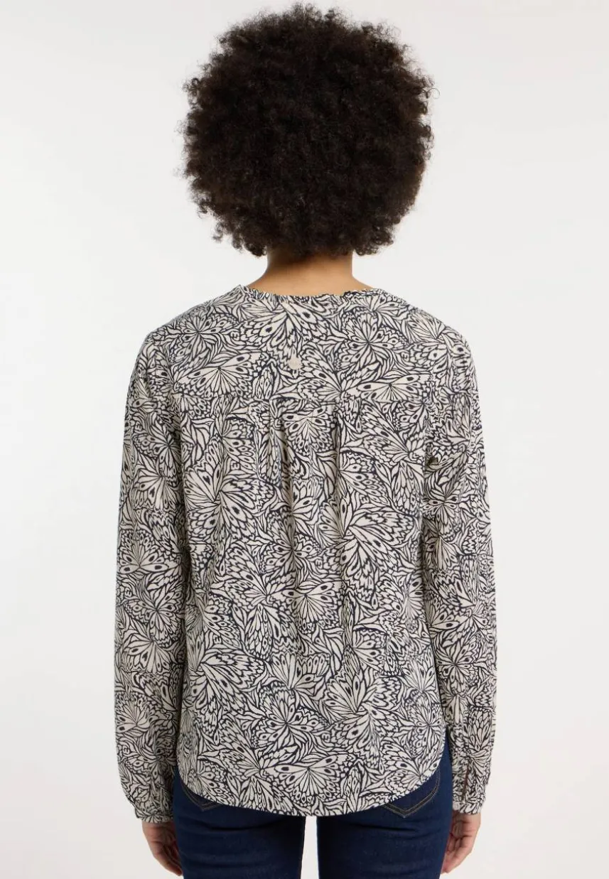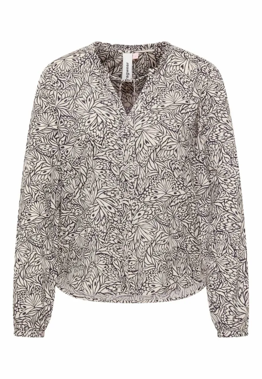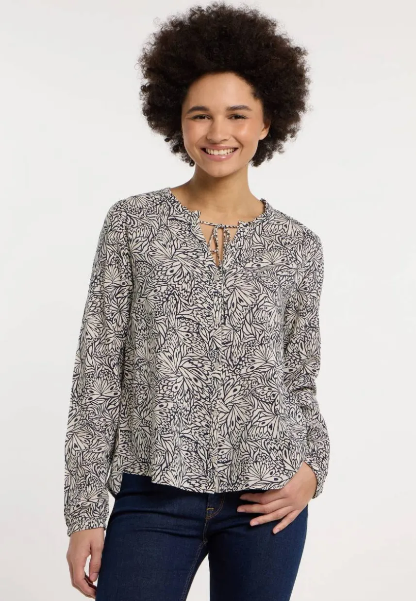 Fühl dich so leicht und unbeschwert wie die IONE PRINT Bluse von ragwear. Aus weichem, gewebtem Material gefertigt, sorgt diese Bluse auch an wärmeren Tagen für ganztägigen Komfort. Die lockeren Ärmel enden mit zarten Bündchen an den Handgelenken, während die Knopfleiste vorne durch feine Raffungen unterhalb der Rückenpasse harmonisch ergänzt wird. Der V-Ausschnitt mit stylischem Kordelzug und verspielten Rüschen verleiht eine mühelos schicke Silhouette. Modisch, luftig und perfekt für all deine Sommerabenteuer!