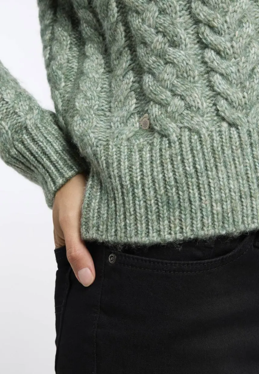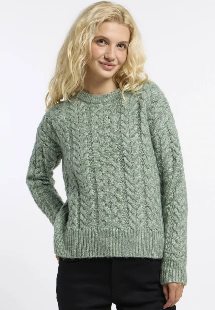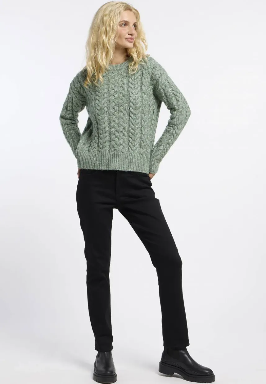 Bequem, kuschelig und wunderschön: Der vegane Strickpullover ‚JANNINA‘ macht alles richtig. Das weiche Strickmaterial mit Zopfmuster, der Rundhalsausschnitt und der lässige, verkürzte Schnitt machen ihn zu einem modischen und gleichzeitig gemütlichen Begleiter. Einfach überziehen, mühelos kombinieren und sich bereit machen für winterliche Abenteuer – dieser Pullover ist die perfekte Wahl für einen entspannten und stilvollen Look.
