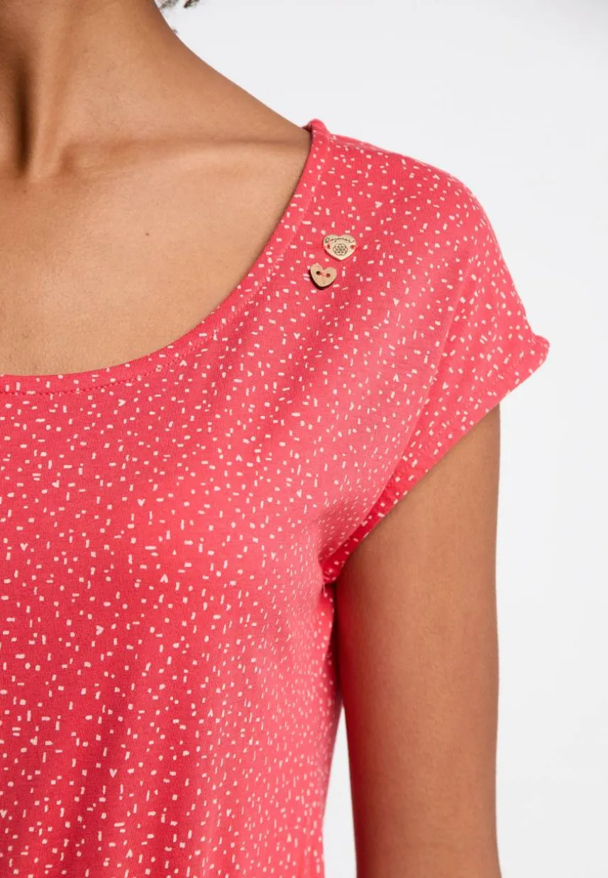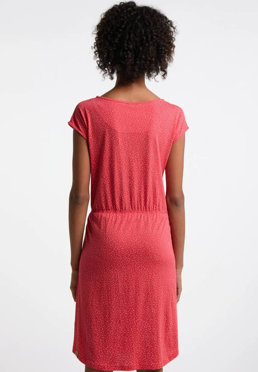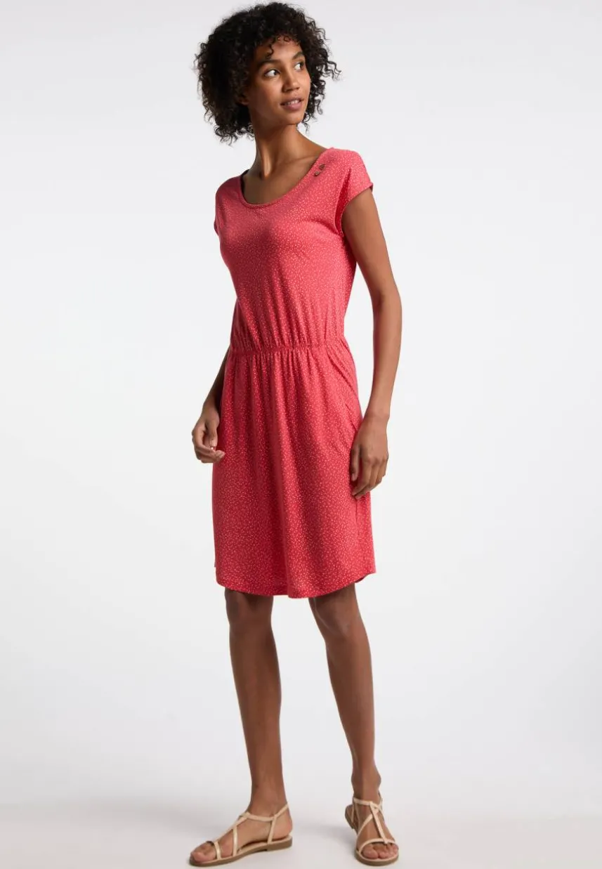 Das vegane ragwear Sommerkleid ‚LILITHE‘ ist mit seinem femininen Schnitt und dem gemusterten Jersey-Stoff ein wahrer Hingucker. Deine Silhouette wird mit den überschnittenen Schultern, dem Gummizug in der Taille und der Knielänge perfekt in Szene gesetzt. Der große Rundhalsausschnitt wird von zwei Dekoknöpfen verziert. Dieses sommerliche Kleid ist perfekt zum Reinschlüpfen und Wohlfühlen.