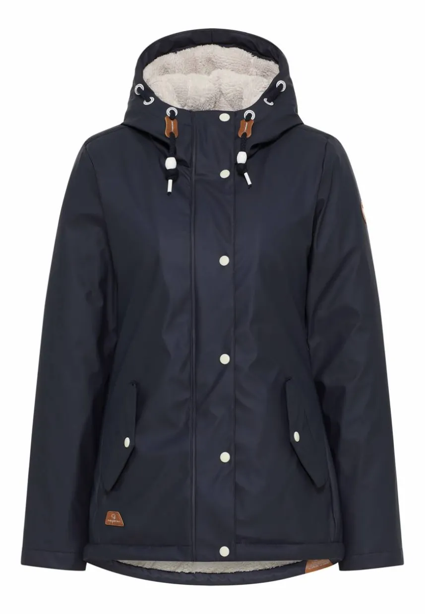 Die vegane Regenjacke ´MARGGE` von ragwear besteht aus einem wasserabweisenden Material und bringt Dich mit ihren abgedichteten Nähten trocken durch Regen und Schneeschauer. Gefüttert mit kuscheligem Teddy-Fell ist sie Dir in der Übergangszeit und im Herbst ein zuverlässiger Begleiter. Geschlossen wird sie mit einem durchgehenden Reißverschluss, der sich unter einer Druckknopfblende befindet. Die Kapuze mit Teddy-Futter und Kordel schützt Kopf und Nacken. In den praktischen Klappentaschen mit Druckknopf kannst Du alles Wichtige verstauen. Die Jacke ist bequem geschnitten mit geknöpften Riegeln im Rücken. Unter den Armen befinden sich kleine Belüftungslöcher.