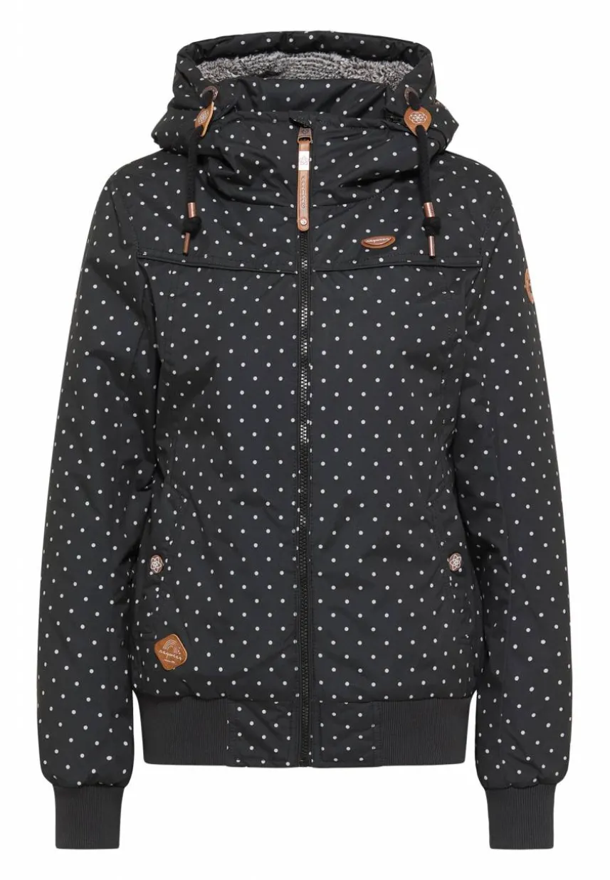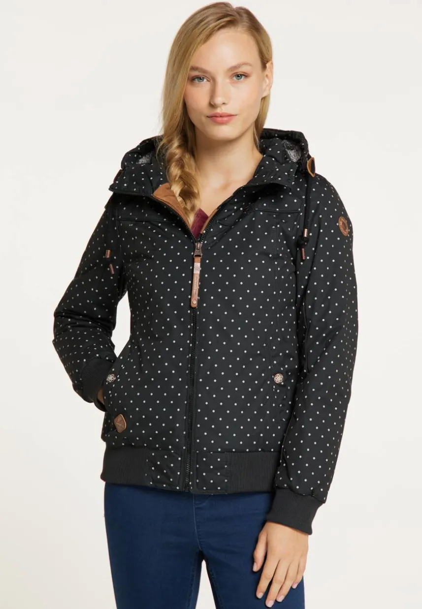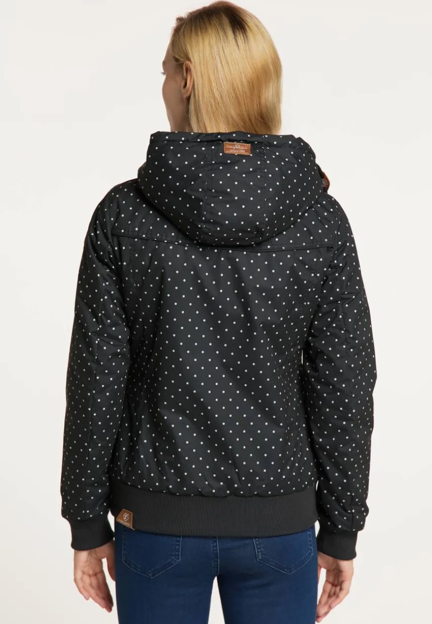 Die vegane Jacke ´NAANY DOTS` von ragwear zeigt sich in allseits beliebtem Punktemuster und praktischen Details. Die schöne Jacke hat eine, mit weichem Kunstfell gefütterte, abnehmbare Kapuze mit Kordel, ist leicht tailliert und sowohl die Ärmel als auch der Saum sind mit angenehmen Rippstrickbündchen ausgestattet. Die seitlichen Eingrifftaschen mit Druckknopf halten Deine Hände warm. Für Handy, Geldbörse und Schlüssel gibt es ein den seitlichen Eingrifftaschen genügend Platz. Besonders aufgewertet wird diese hochwertige Regenjacke durch die zahlreichen, kraftvollen Details und Symbole, wie die „Blume des Lebens“ und die „Venusblume“, die Dich im Alltag unterstützen können.
