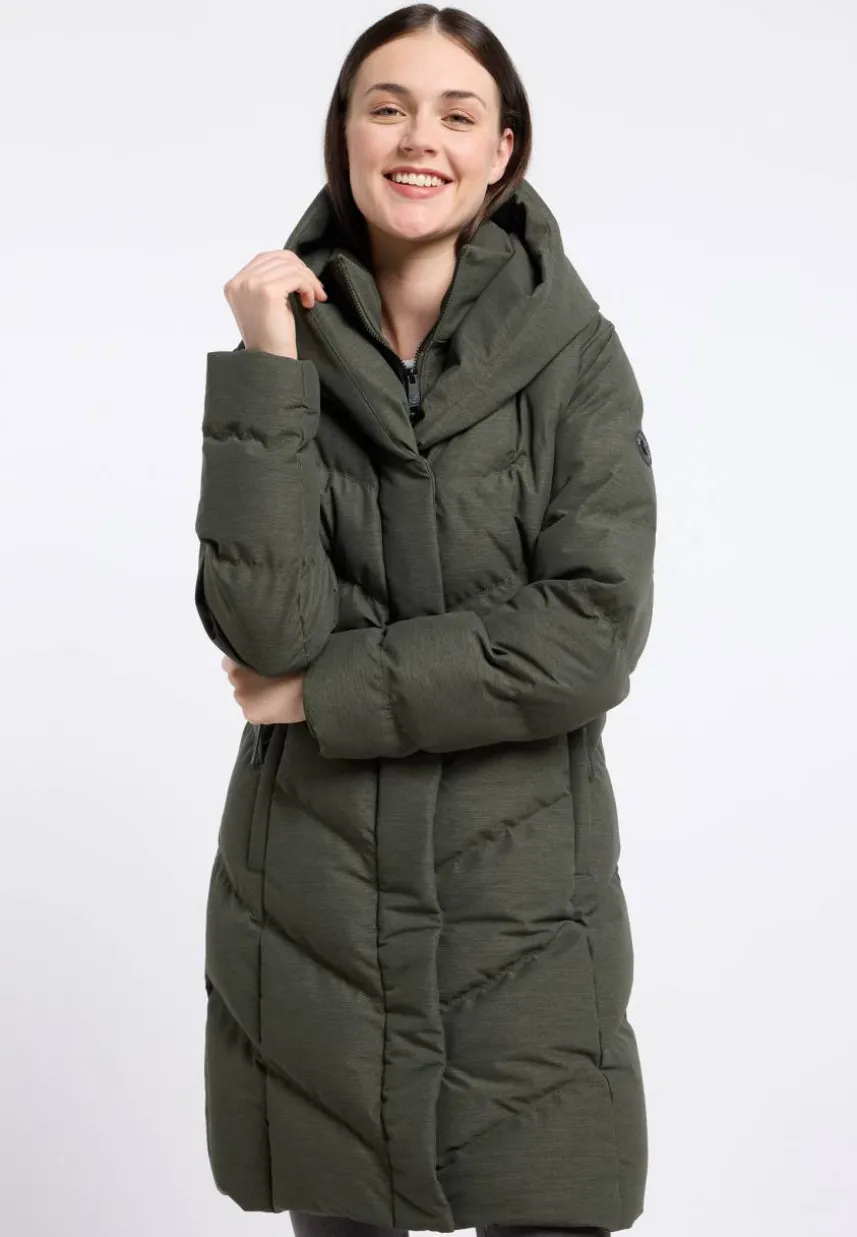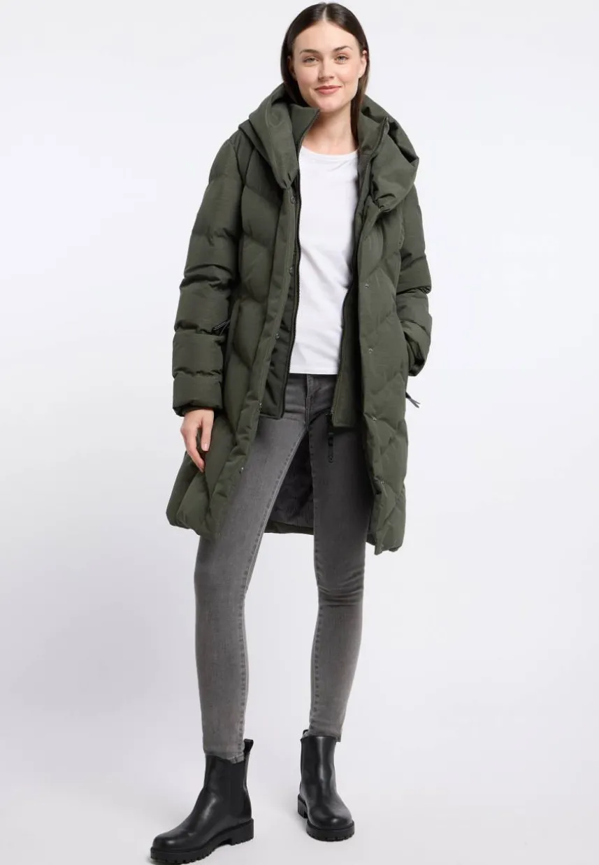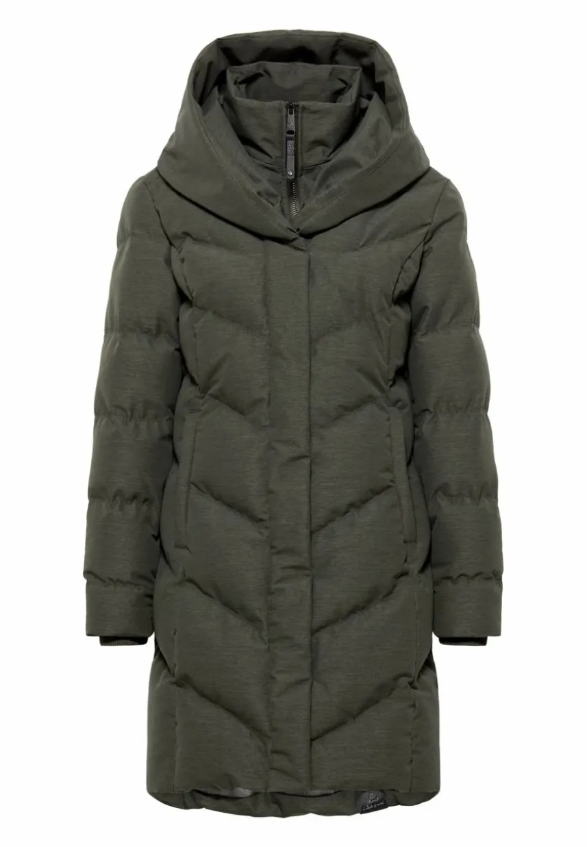 Mit ragwears dick gefüttertem Wintermantel ‚NATALKA‘ bist du diesen Winter bestens beraten. Das feminine Design sieht nicht nur toll aus, sondern hält auch warm. Mit einer Kombination aus Stehkragen und großer Kapuze, elastischen Bündchen und den seitlichen Eingrifftaschen mit Reißverschluss bleibt kaum ein Teil deines Körpers ungeschützt. Schräg verlaufende Steppungen runden den Look des veganen Mantels stilecht ab.