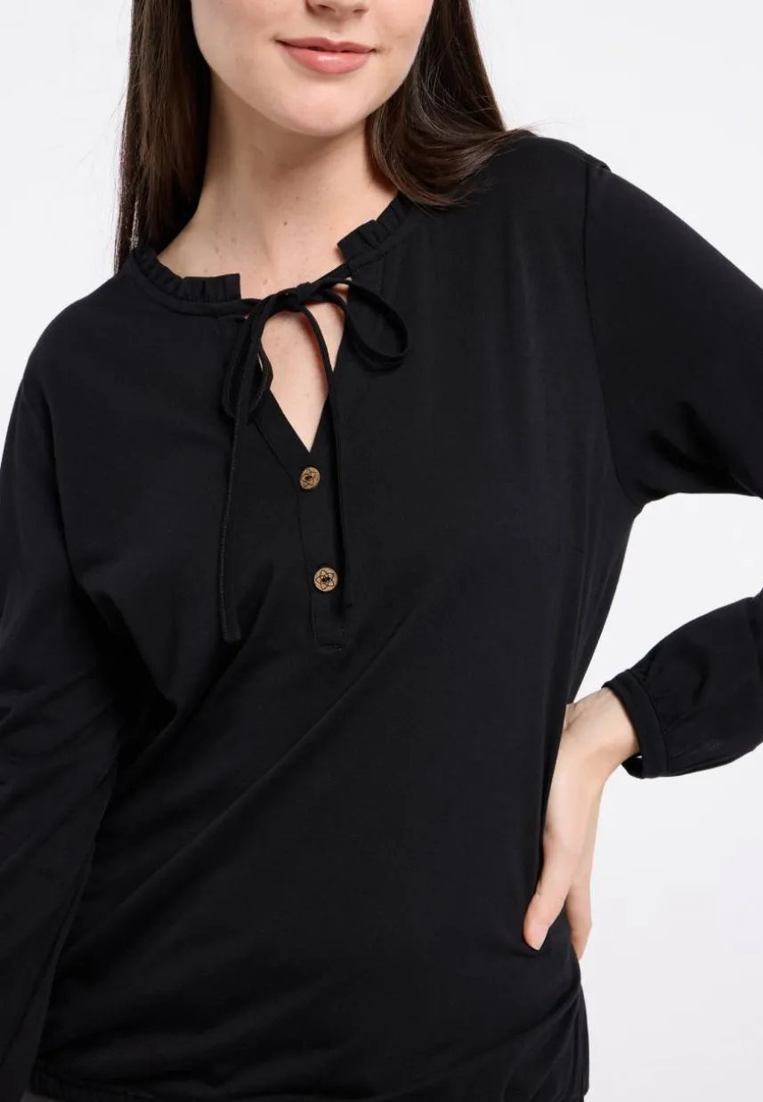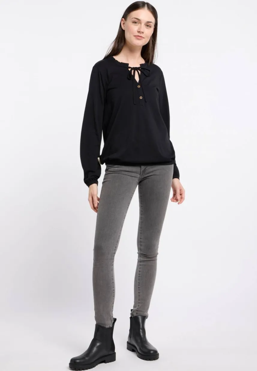 • V-Ausschnitt mit kurzer Knopfleiste und Kordelzug