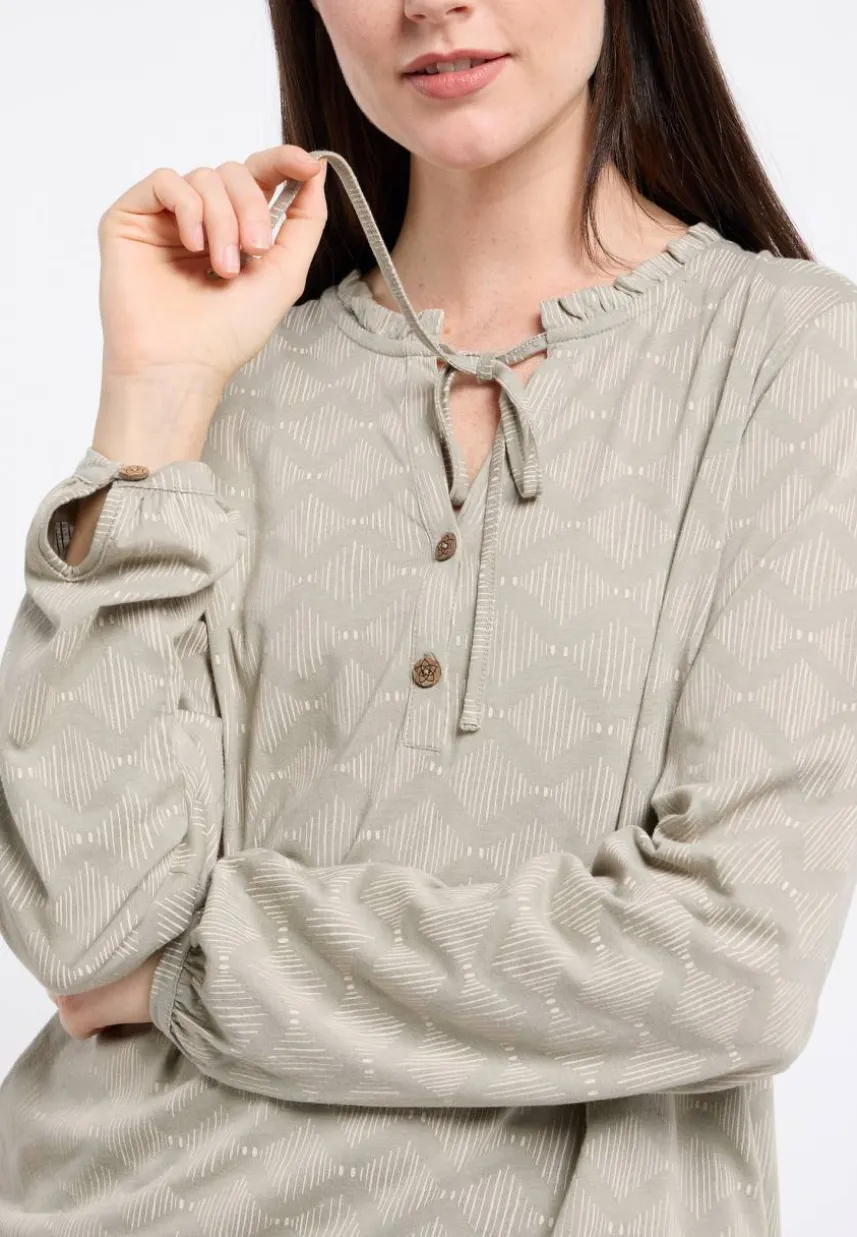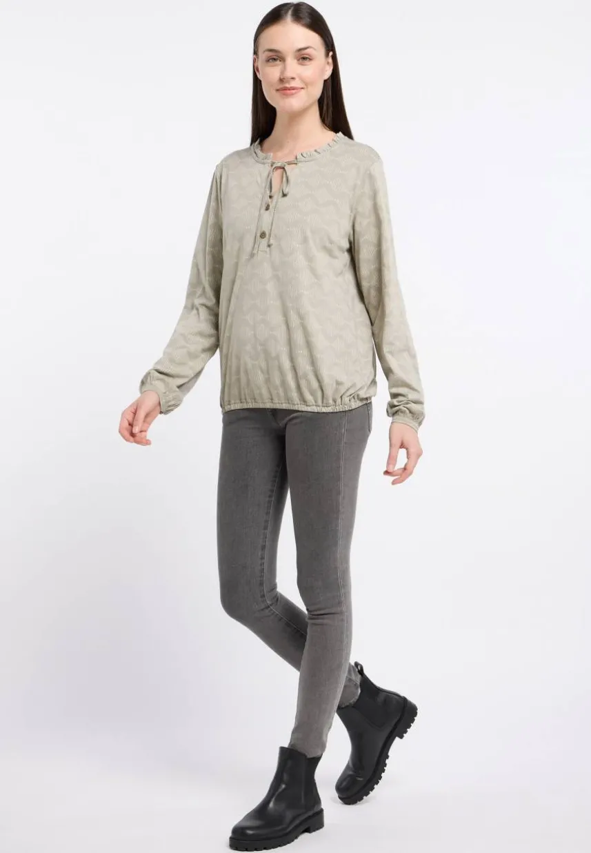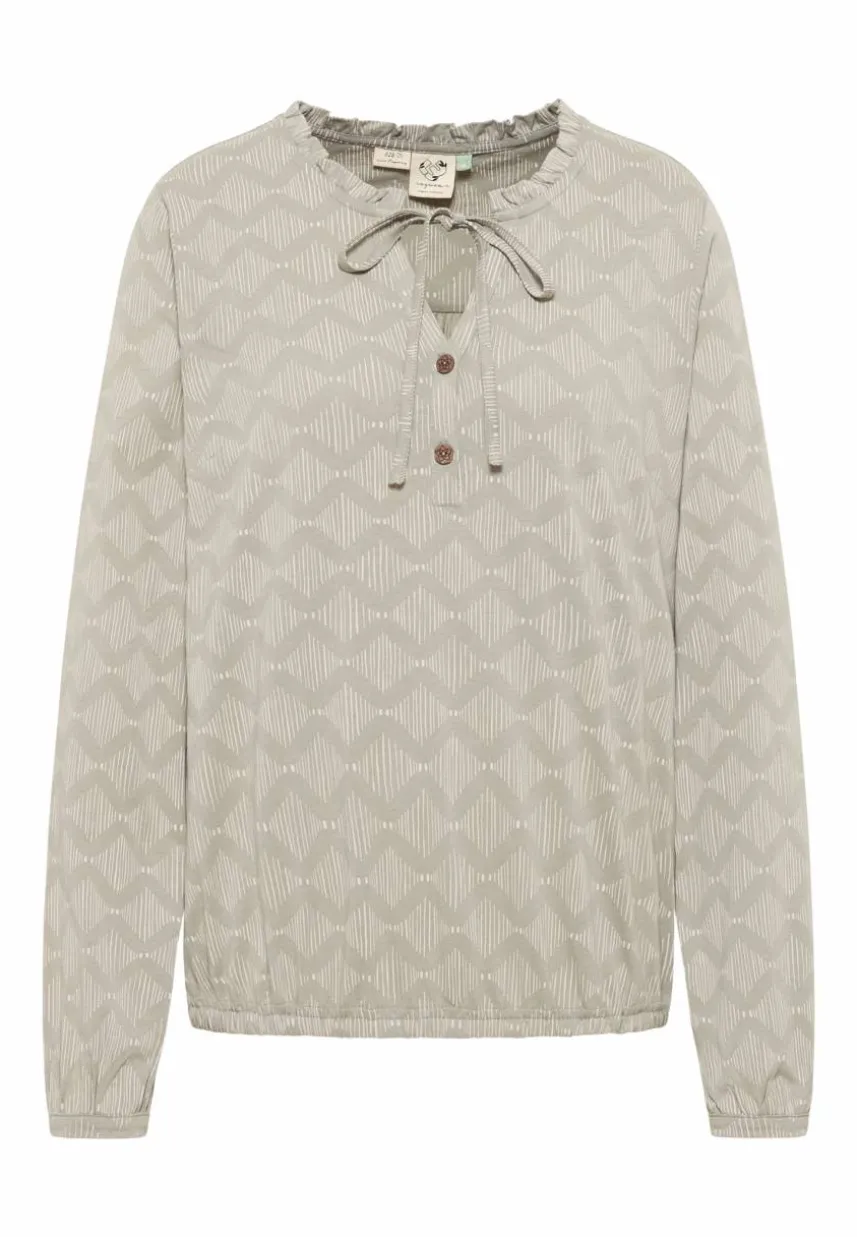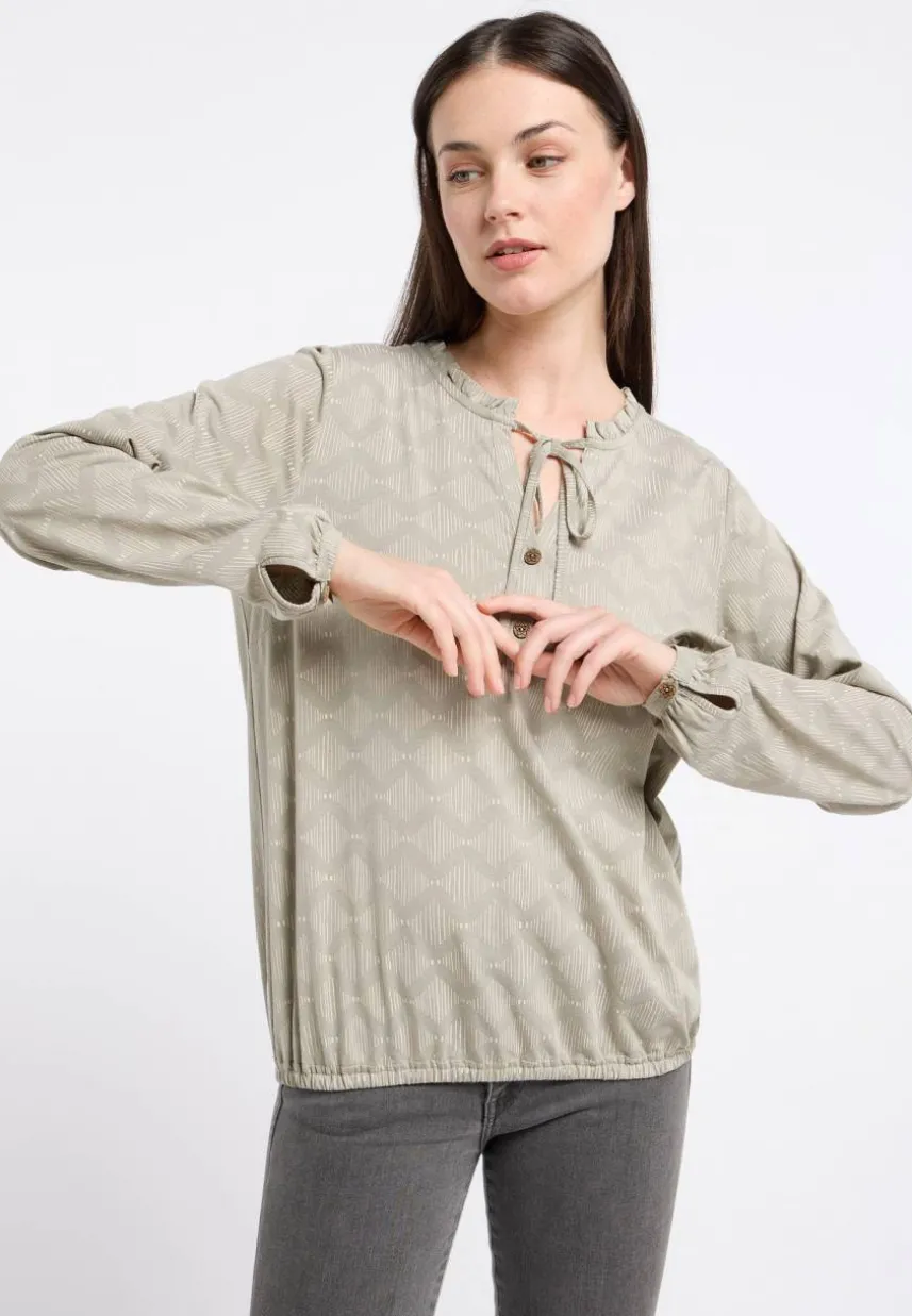 Das Langarm-Top ‚ONELIA ORG PRINT‘ verzaubert durch seinen Schnitt und das grafische Muster. Mit seinem weichen Material und einem lockeren Schnitt ist dieses Oberteil perfekt für jeden Anlass. Die weiten Ärmel mit dünnen Bündchen am Handgelenk verleihen dem Look eine entspannte Note. Eine leichte Raffung unter der Passe auf der Rückseite sorgt für eine interessante Optik. Der V-Ausschnitt mit Knopfleiste wird durch einen Kordelzug und Rüschen am Halsausschnitt betont. Super modisch und vielseitig für den Alltag oder besondere Anlässe.