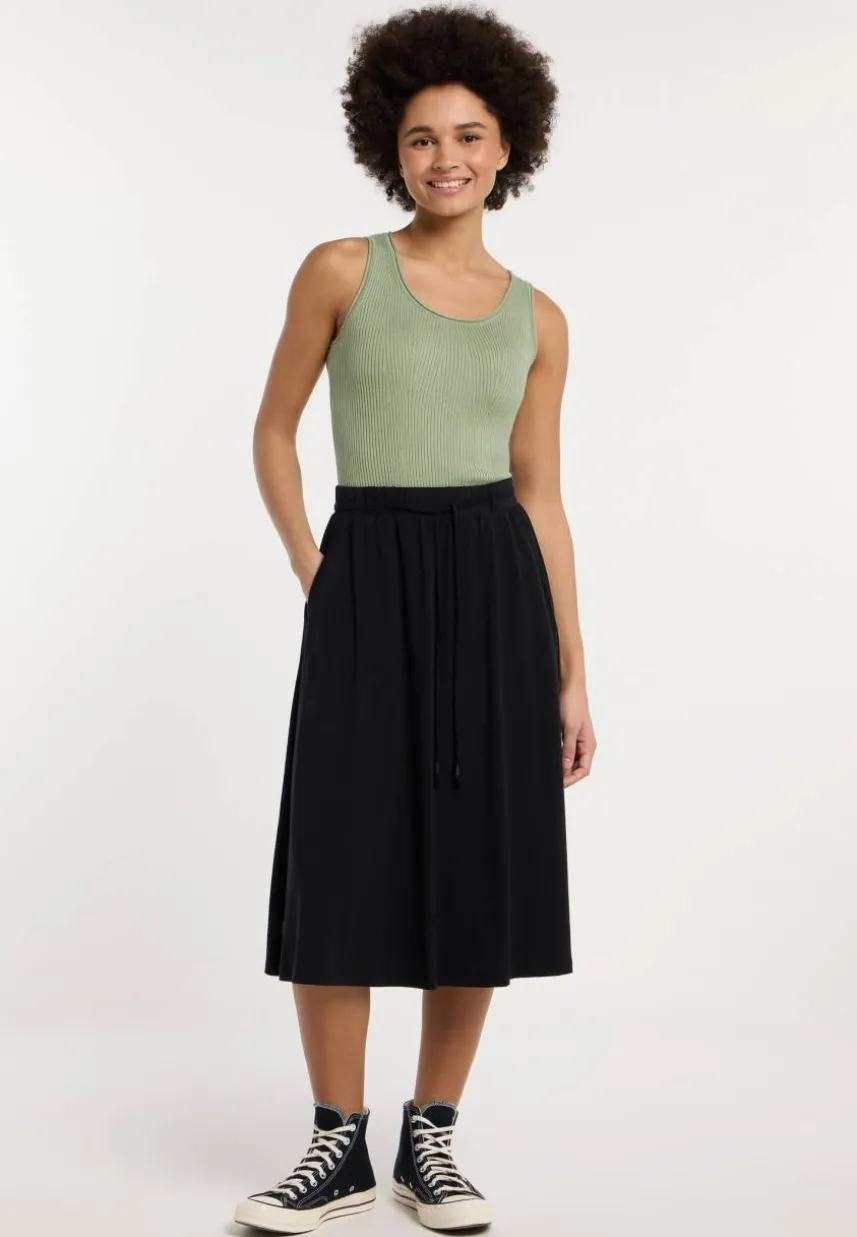 Der vegane Rock REIKKO von ragwear ist ein unkomplizierter Begleiter für viele sommerliche Outfits. Der bequeme, elastische Gummi-Bund mit Gürtelschlaufen und dünnem Flechtgürtel, sowie seitliche Eingrifftaschen sind praktisch und bequem. Der leichte Jersey-Stoff schwingt bei jedem Schritt mit und gibt Dir auch bei Hitze ein frisches Gefühl.