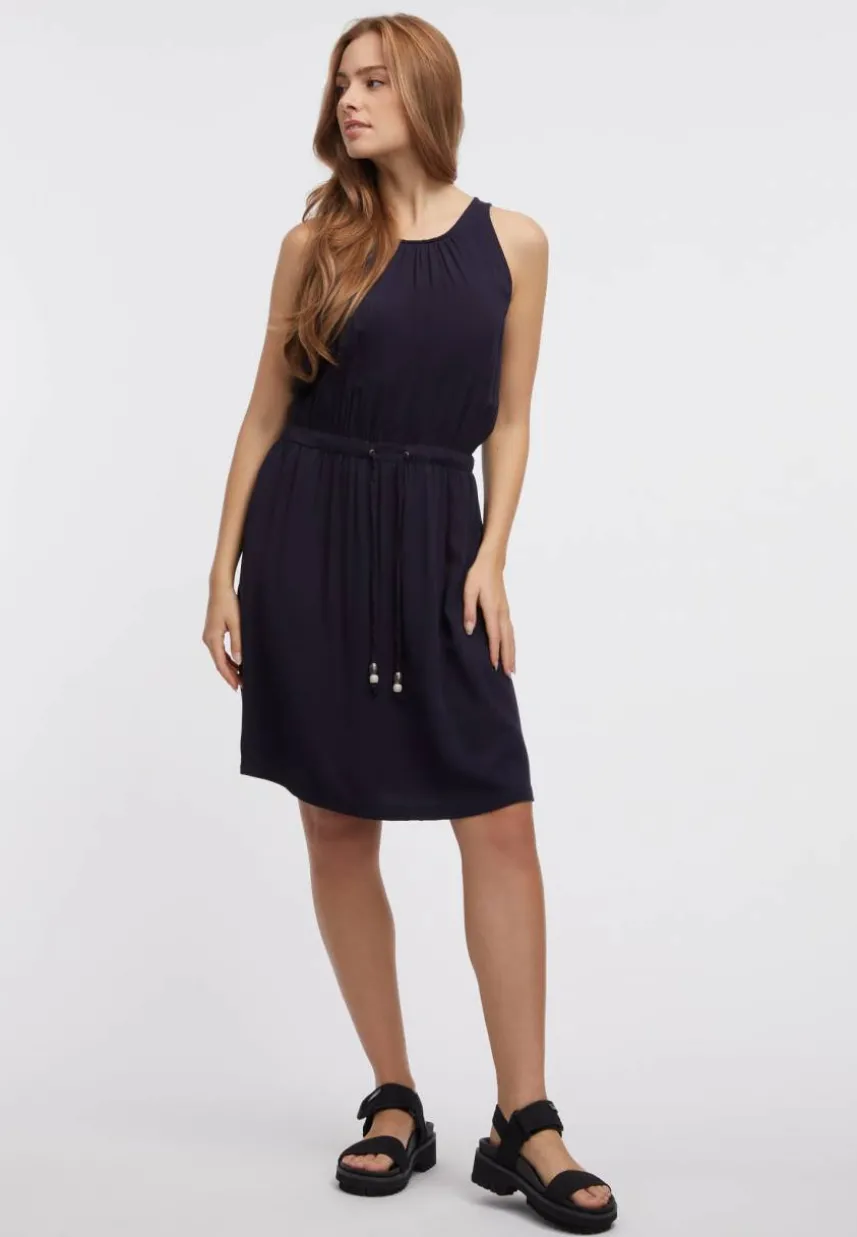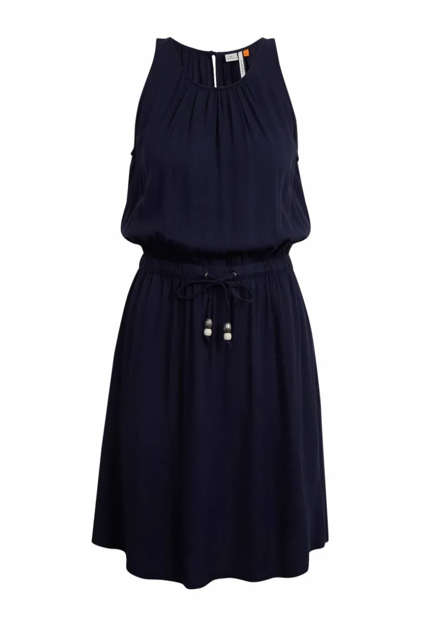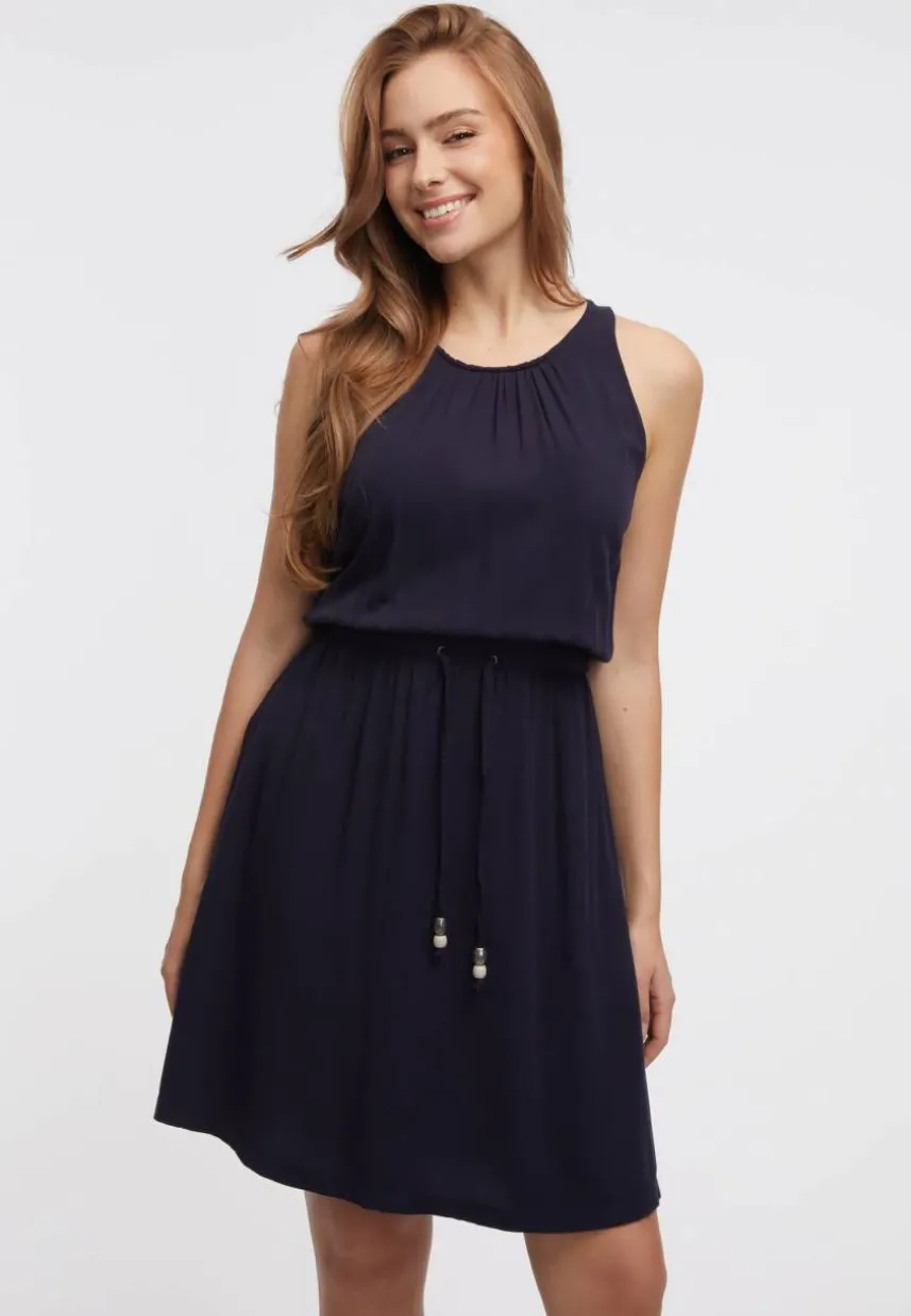 Das vegane Sommerkleid ‚SANAI‘ von ragwear begeistert mit einem femininen Look. Dafür sorgen die Silhouette, sowie Raffungen am Rundhalsausschnitt und in der Taille. Diese lässt sich mit einem Bindeband im Tunnelzug individuell regulieren. Trägerlos und mit einem ausgestellten Rockteil ist das Kleid luftig und bequem.