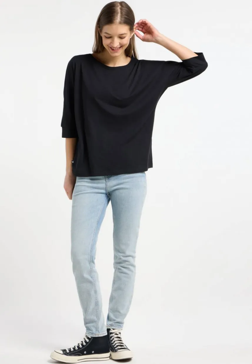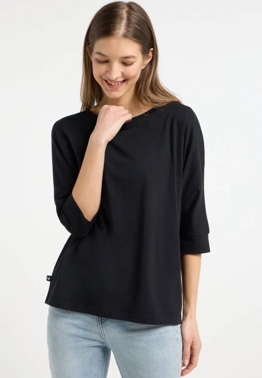 Mit dem Langarmshirt SHIMONA von ragwear verleihst du deiner Freizeitgarderobe meinen neuen Twist – die perfekte Mischung aus Komfort und femininem Stil. Die überschnittenen Schultern, der lockere Schnitt und die ellbogenlangen Ärmel sorgen für einen stilvoll-schlichten Look. Das weiche Jersey-Material besteht aus Baumwolle und aus REPREVE®-Performance-Fasern, die aus recycelten Plastikflaschen hergestellt werden. Ob du zu Hause entspannst oder unterwegs bist, dieses vegane Top liefert die perfekten Vibes.