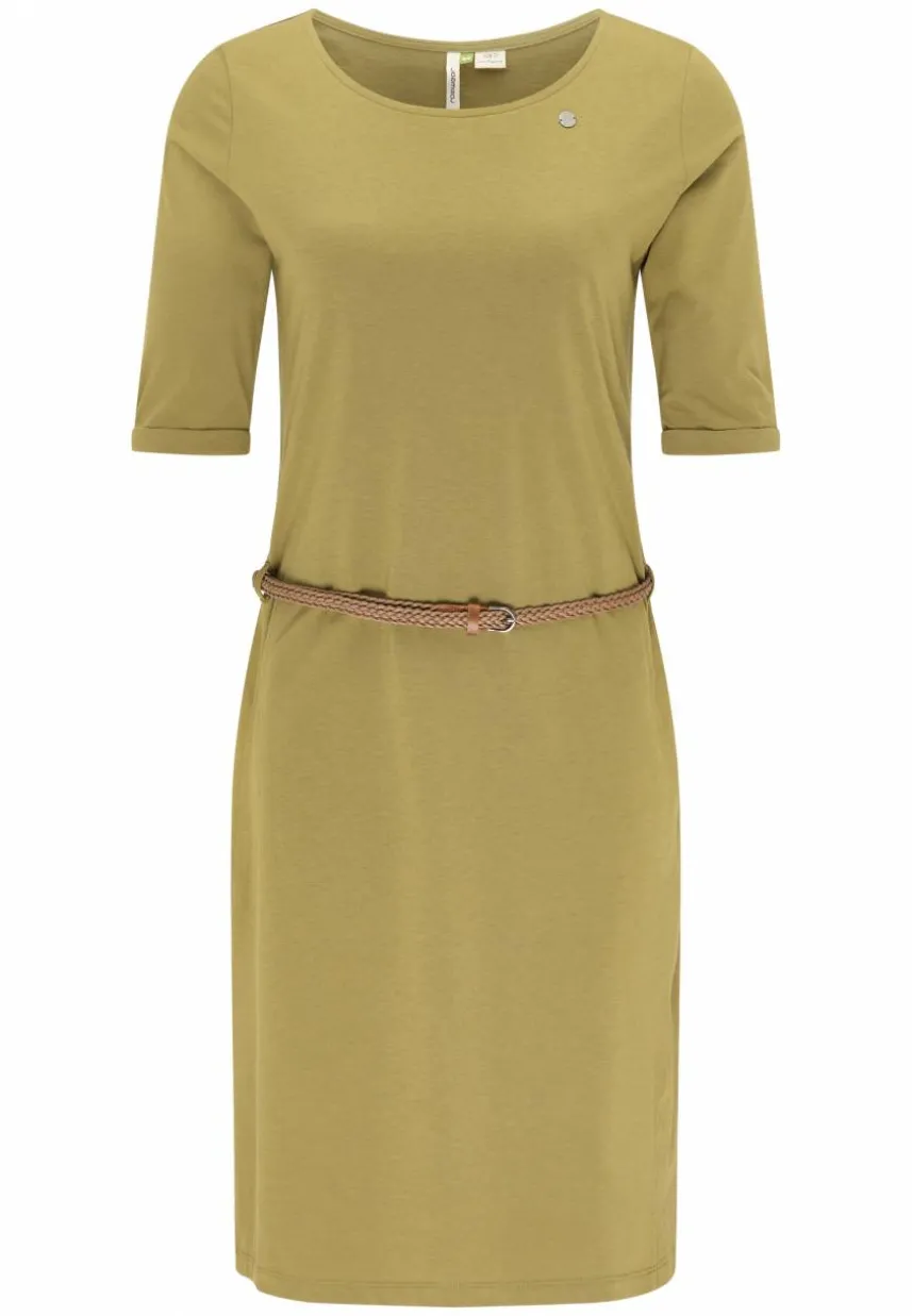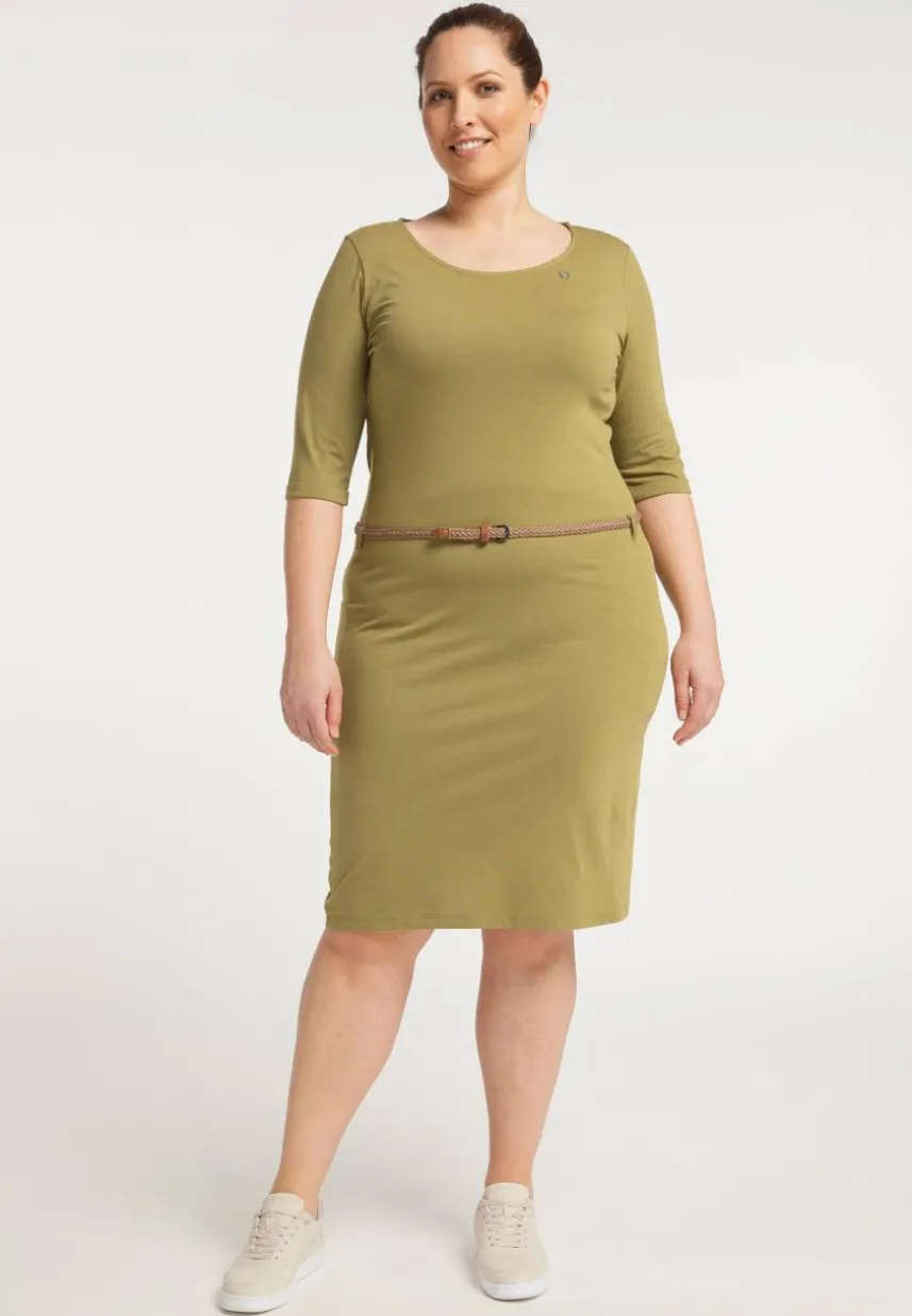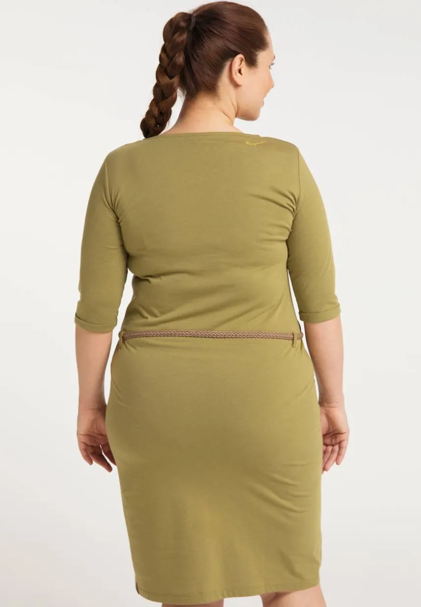 Das vegane Kleid ´TAMILA ORGANIC PLUS' von ragwear kannst du, mit seinen halblangen Ärmeln, auch schon im Frühling mit Leggins und Boots tragen. Der weiche Bio-Baumwoll-Mix trägt sich aber auch im Sommer sehr angenehm, schon allein wegen dem bequemen Schnitt, den Du mit einem Flechtgürtel in der Taille akzentuieren kannst. Ein großer Rundhalsausschnitt mit Label-Applikation und der gerade Saum, der über dem Knie endet, geben dem Kleid einen fast schon klassischen Look. Das schlichte Design, macht es zu einem Allrounder, der sowohl im Büro, als auch in der Freizeit gut ankommt. Der warme Khaki-Ton lässt sich sehr gut mit Schwarz, Weiß und Grau kombinieren.